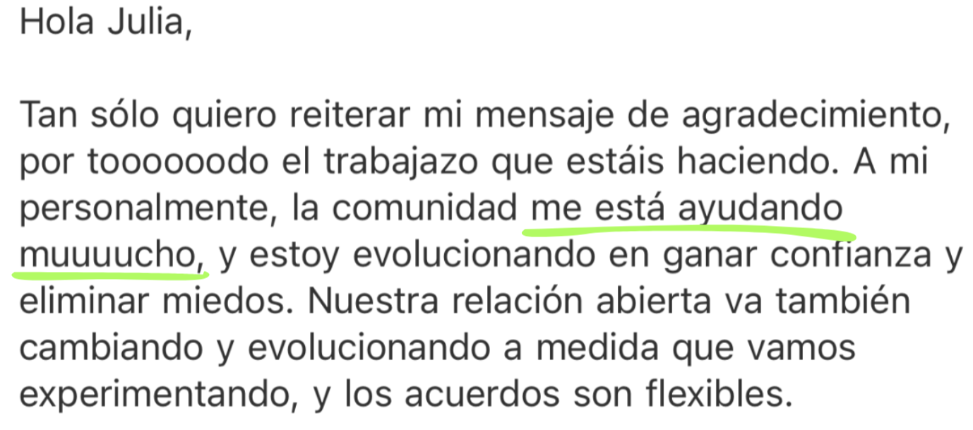 Desde el primer minuto que empiezas con Crecer en Confianza y entras en PULSE, dejas de estar solx. Tienes acceso a una comunidad que te acompaña, yo Julia, entre las primeras.